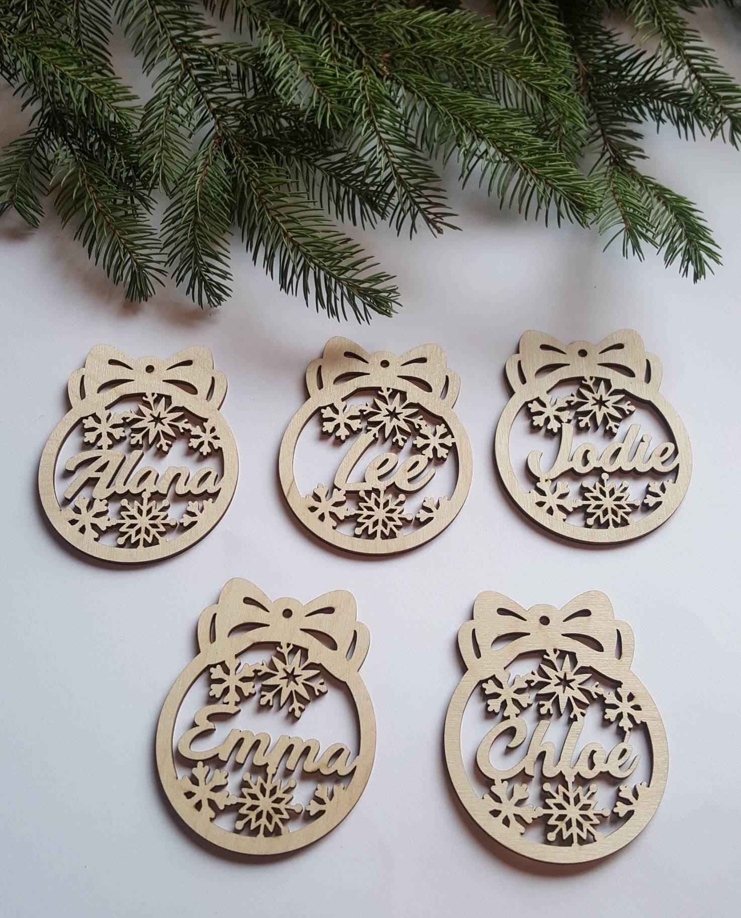 60 personalisierte, lasergeschnittene Weihnachtskugeln aus Holz: Schneeflocken-Set