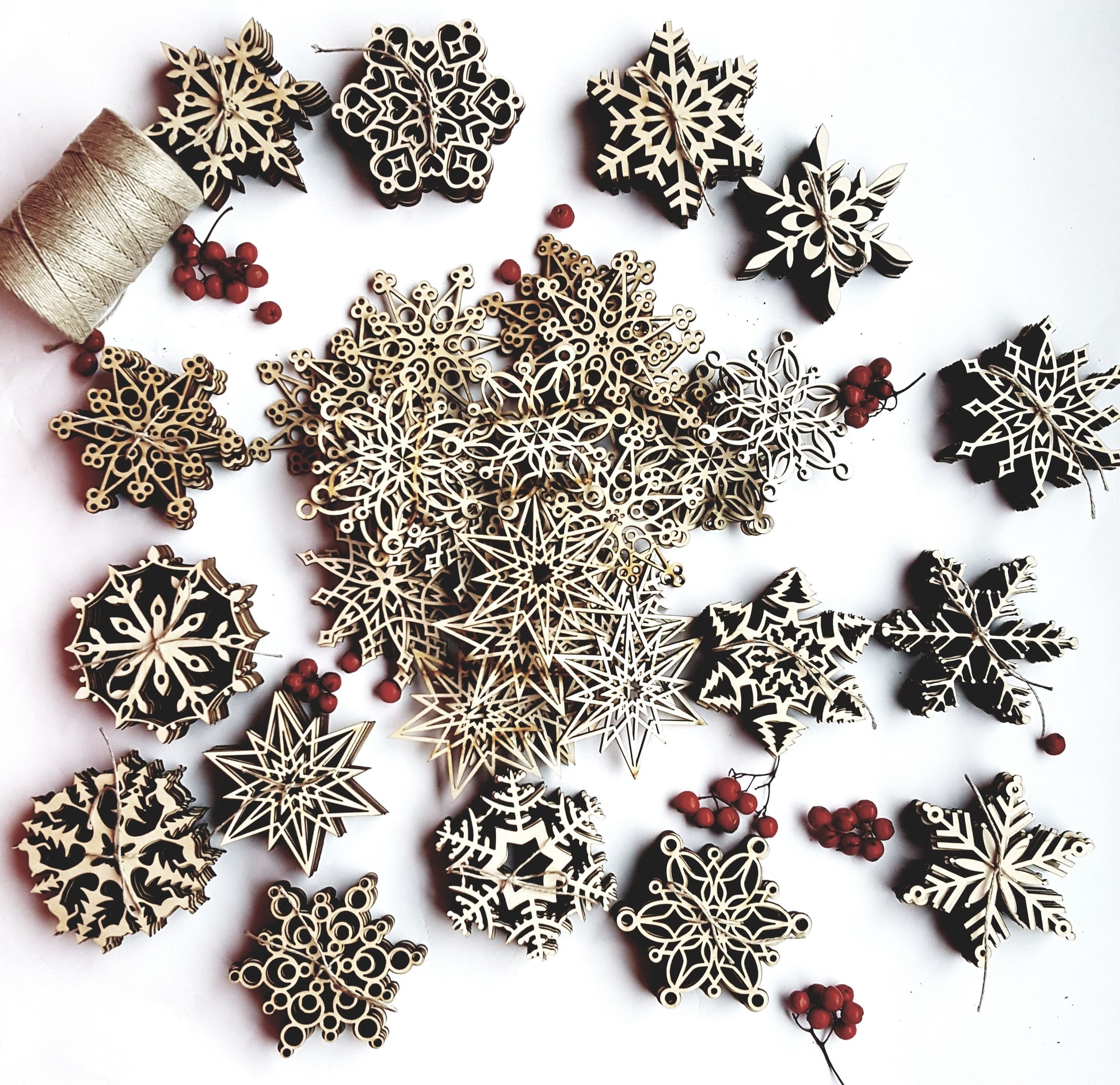 Dieses Angebot umfasst 32 oder 48 lasergeschnittene Schneeflocken aus Holz.
