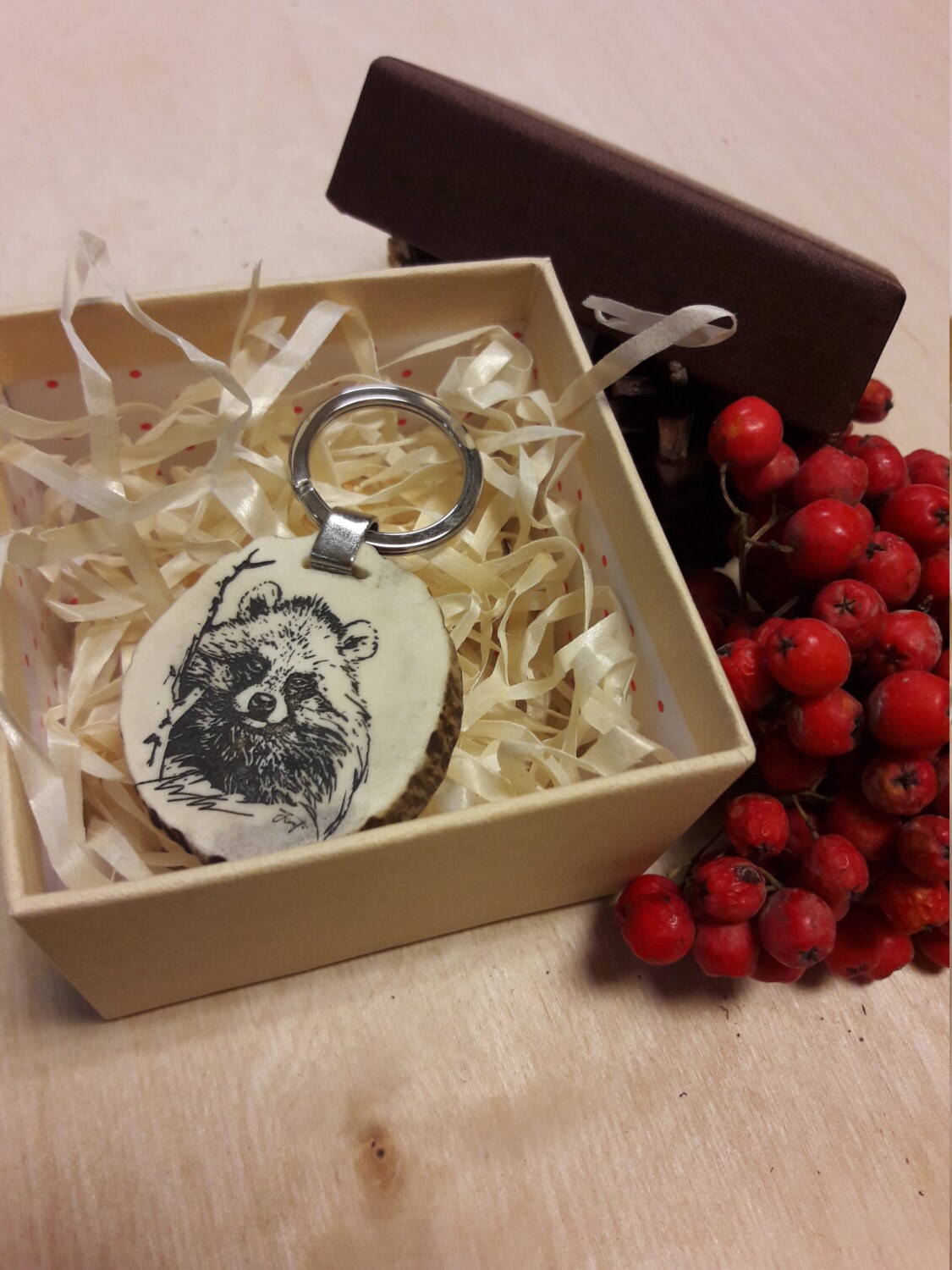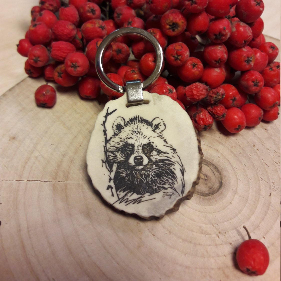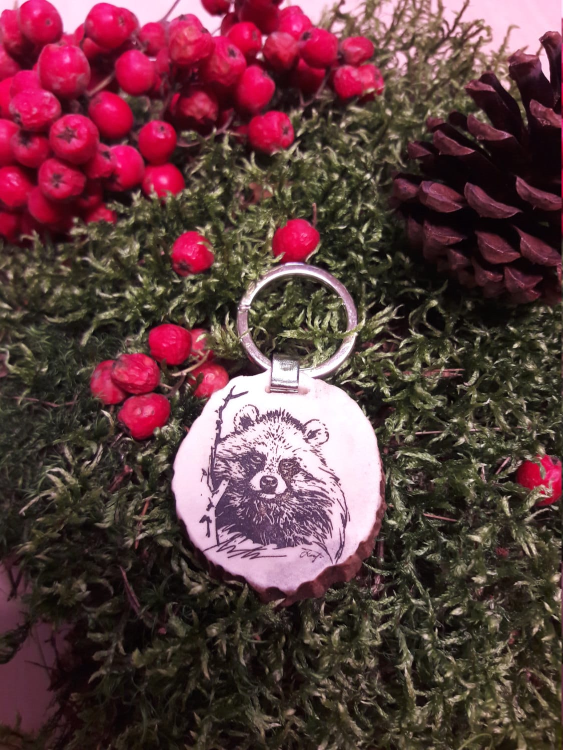 Handgefertigte Schlüsselanhänger mit eingraviertem Waschbärenmotiv aus natürlichem Hirschhorn.