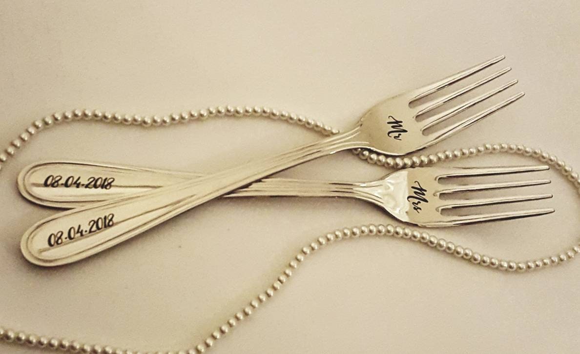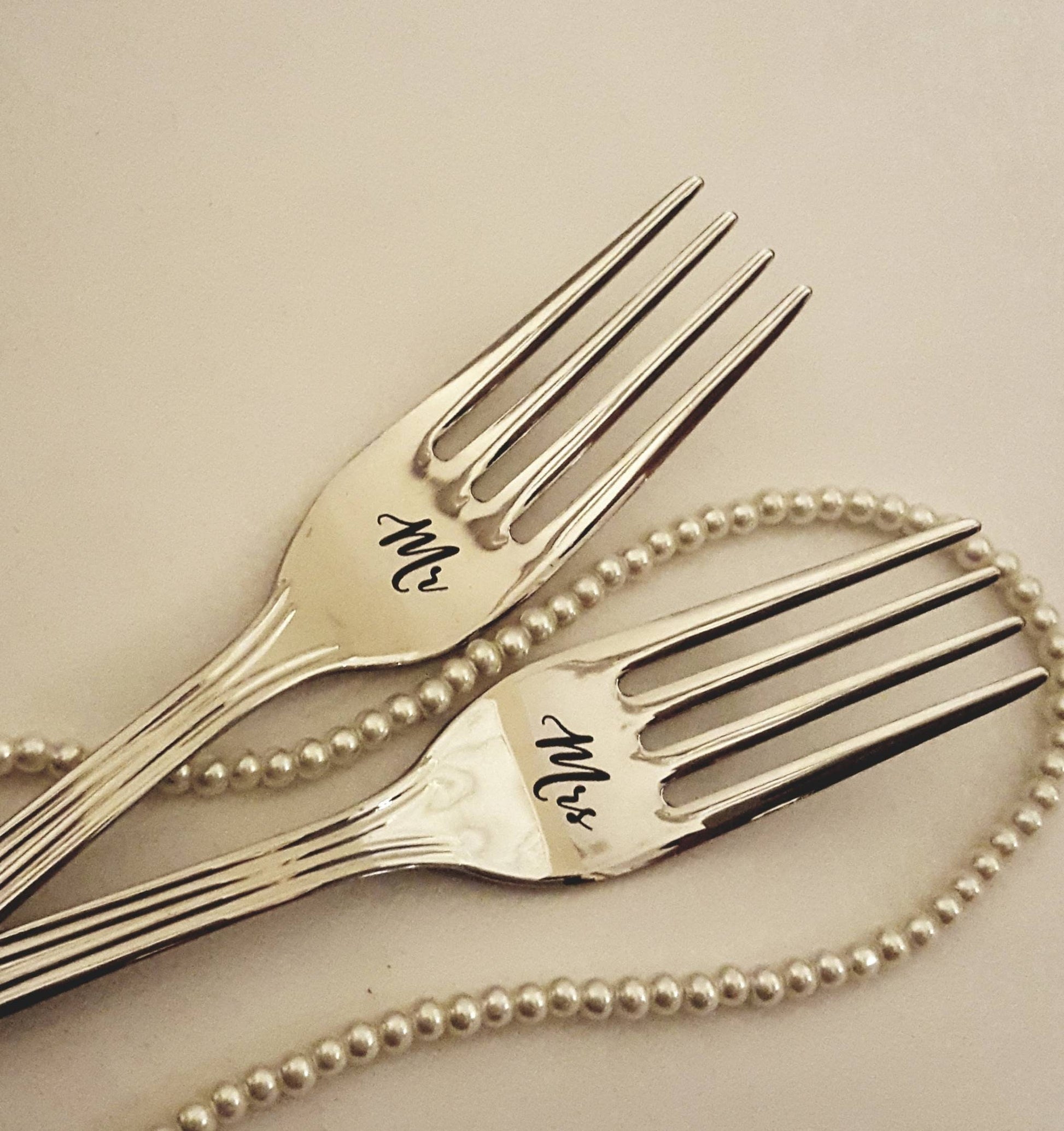 Custom cake forks, engraved wedding dining set, personalized flatware with name date, unique serving gift for bride and groom, mr and mrs