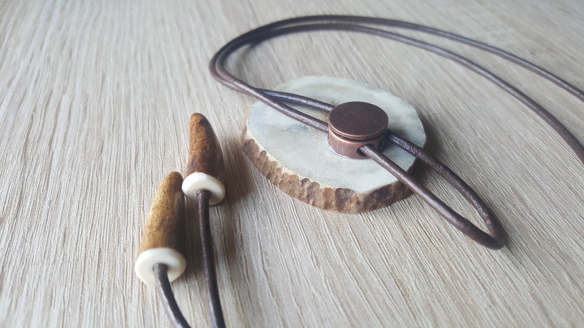 Unique necklace with statement pendant from deer horn and long leather strip.