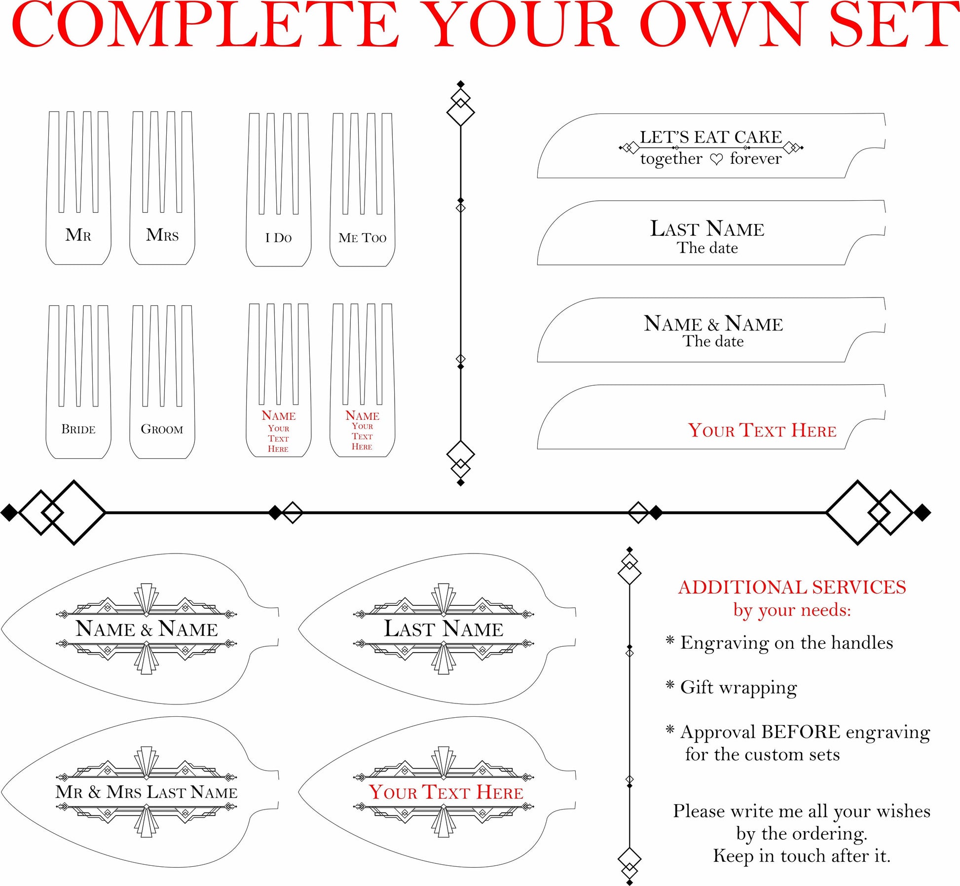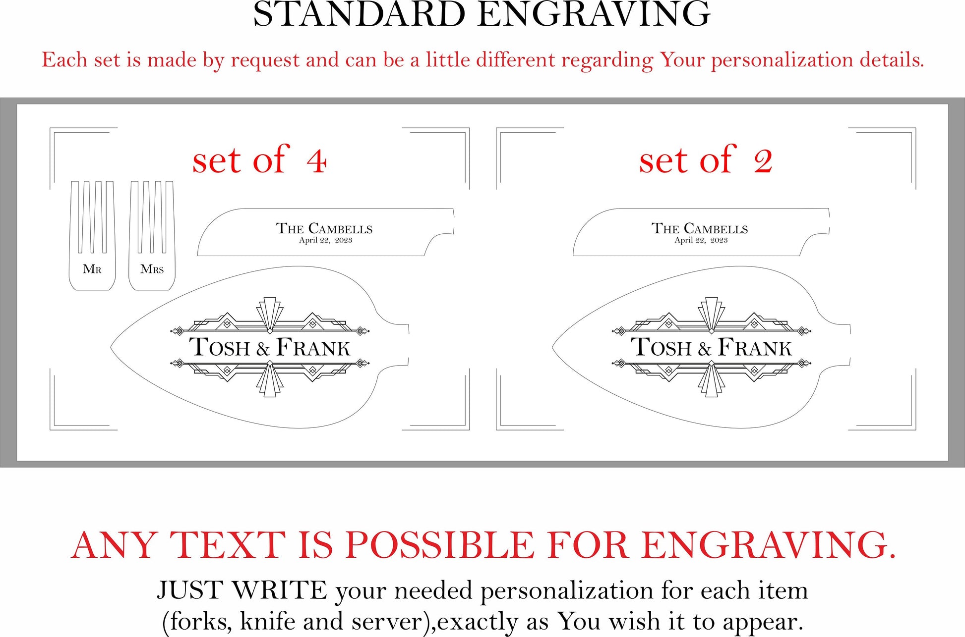 * Personalization: Engraving with laser technology. Included engraving on each pcs. ENGRAVING COLOR CAN'T BE CHANGED - it's dark for the silver, gold and rose gold cutlery, white - for the black set.