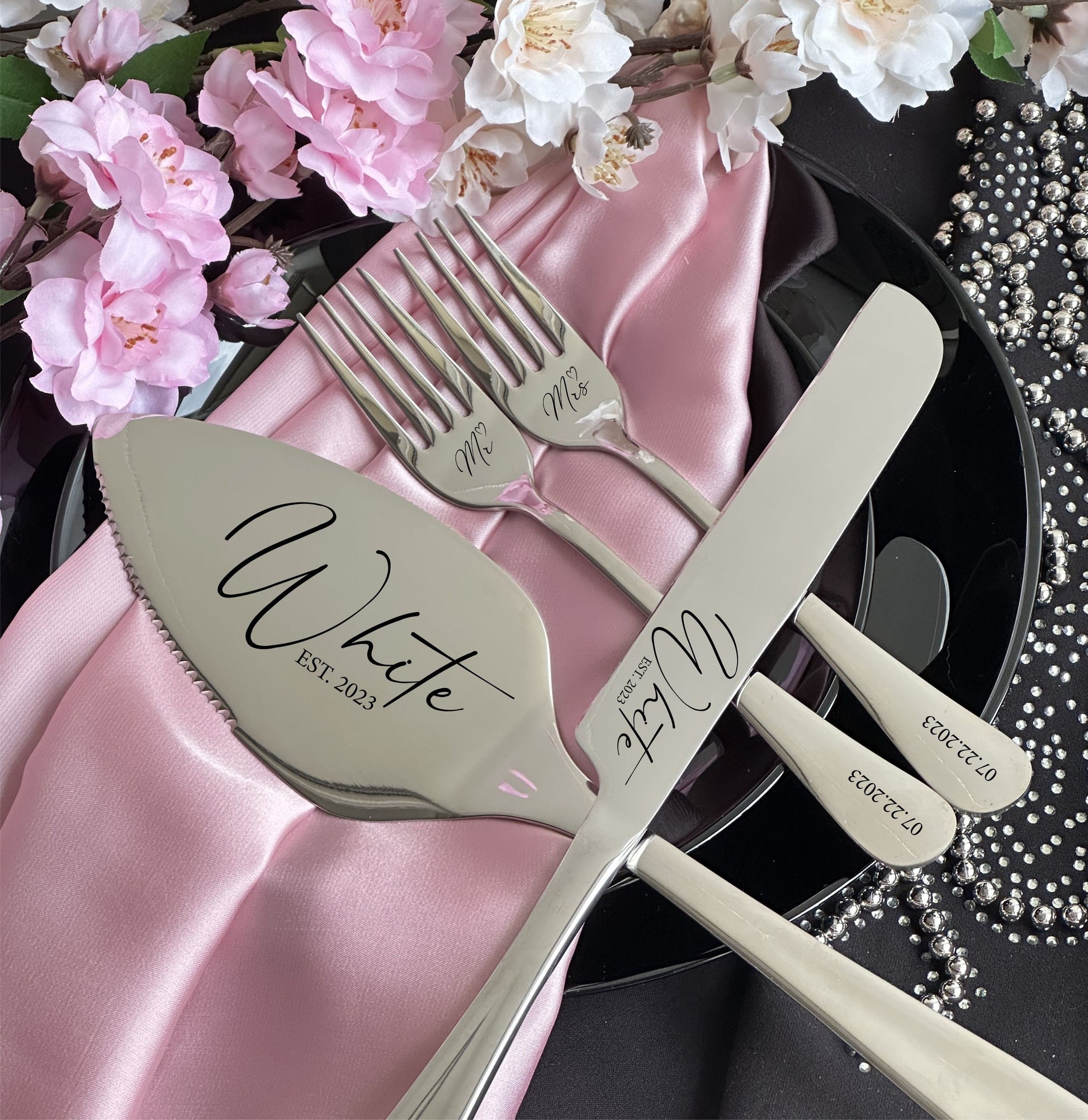 Bring family and friends together with this elegant engraved cake cutting set, complete with matching forks. Personalize with names, initials, a wedding date, or a meaningful phrase. This cutlery kit adds a romantic touch to any celebration while becoming a cherished keepsake for years to come.