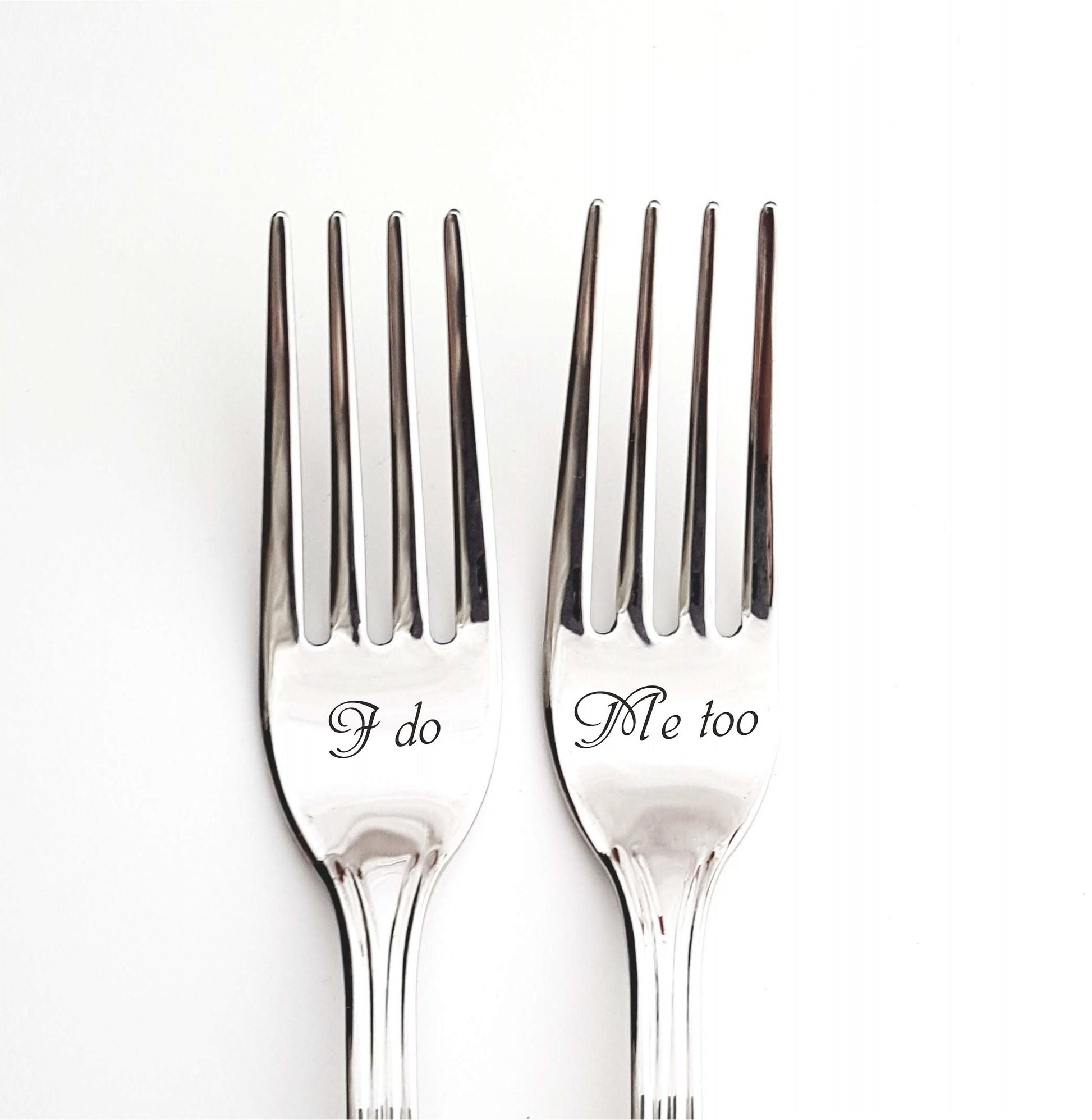Dinner forks for bride and groom, wedding silverware with engraved I do Me too, custom flatware gift for couple, Mr Mrs dining set