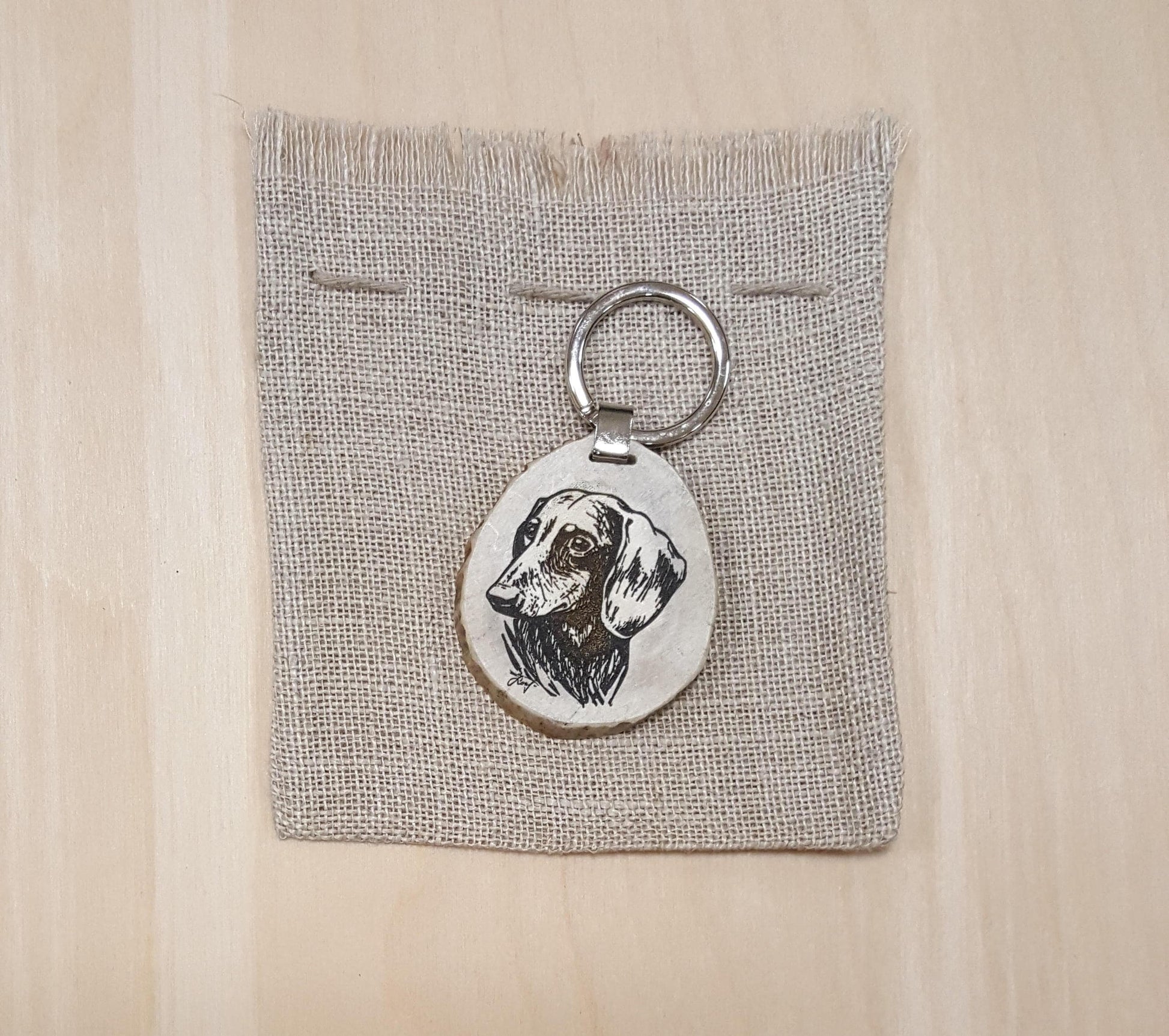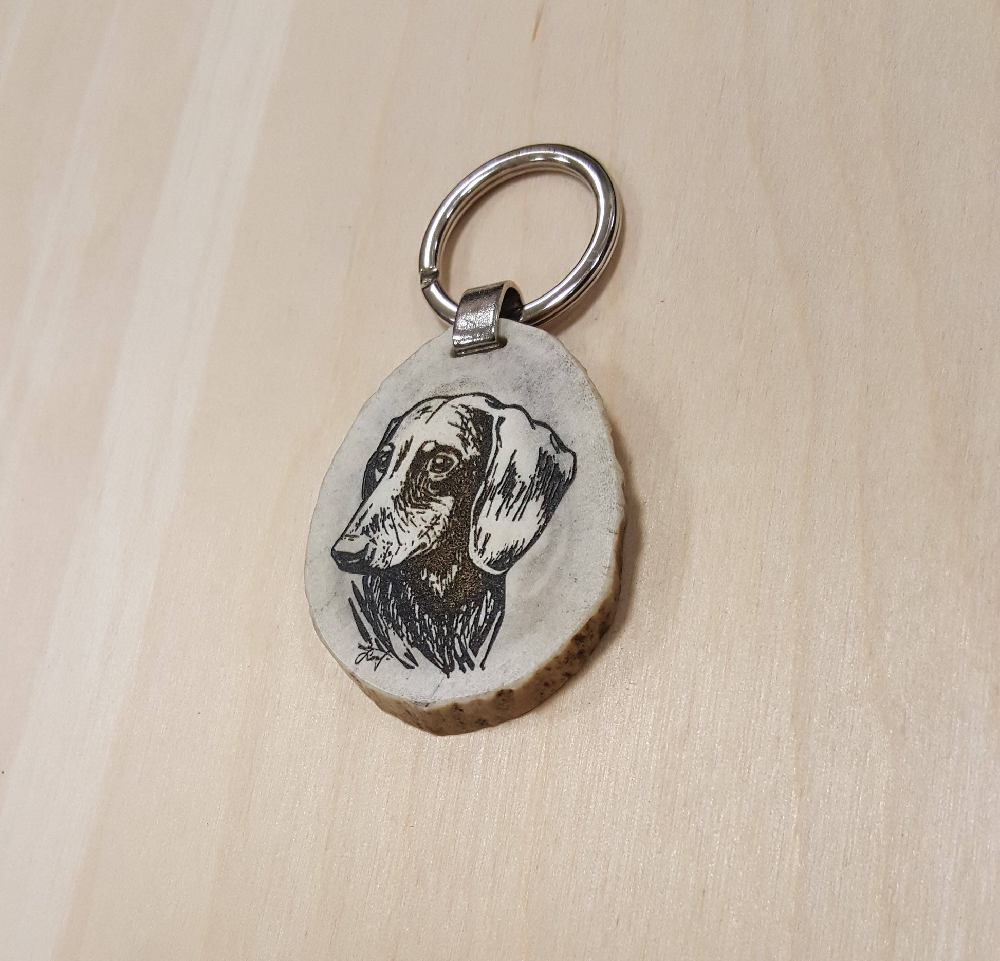 Handmade Keychain with engraved sausage dog are made from natural deer horn. Horn size, color and shape of this product can be different.