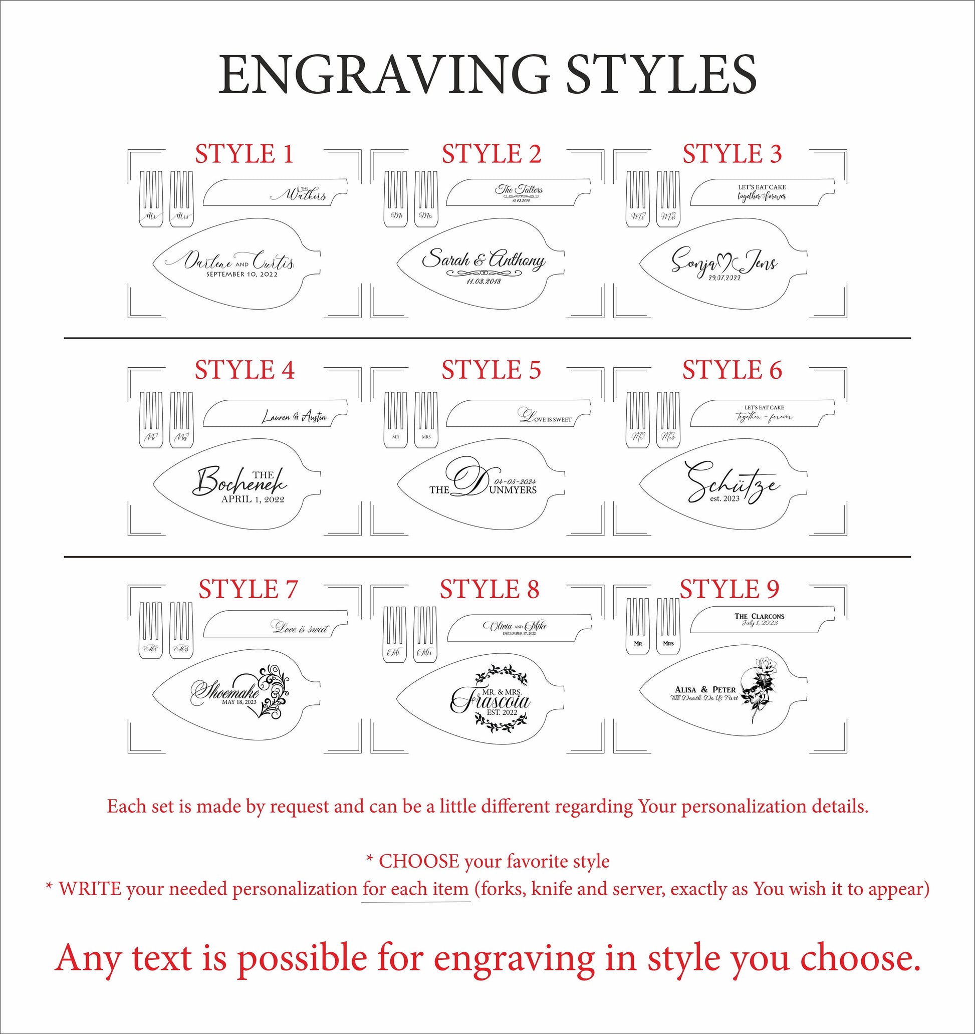 * Personalization: Engraving with laser technology. Included engraving on each pcs. ENGRAVING COLOR CAN'T BE CHANGED - it's dark for the silver, gold, champagne and rose gold cutlery, white - for the black set.