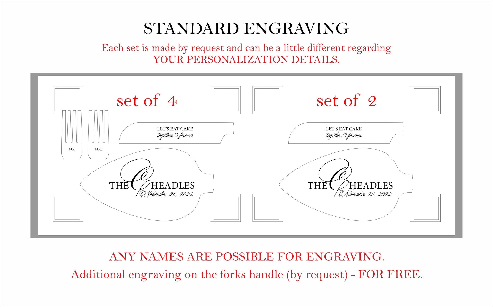 * UNIQUE GIFT IDEA. This is an awesome set of two forks (optional), cake knife and server with personalized engraving on еach pcs. Surprise the engaged couples with these beautiful dinnerware sets as a pre-wedding present. It's one less thing they'll have to worry about purchasing for the reception! Perfect gift for wedding, engagement, anniversary, birthday, housewarming, Bridal Shower party. Christmas or other occasion. Awesome gift for bride, groom, parents, friends, sister or brother.