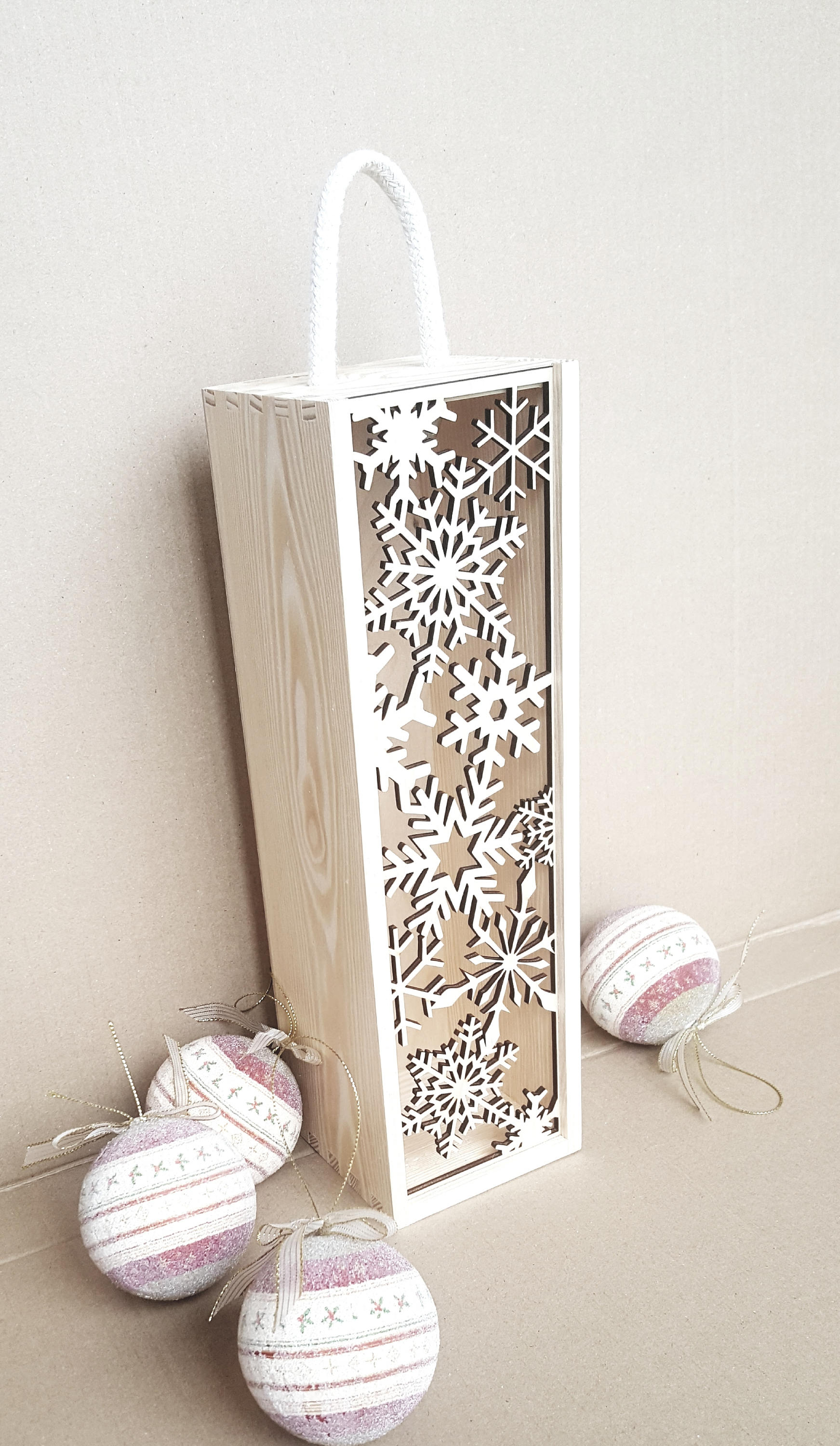 Engraved Wooden Christmas Wine Box: Laser Cut Snowflake Ornament