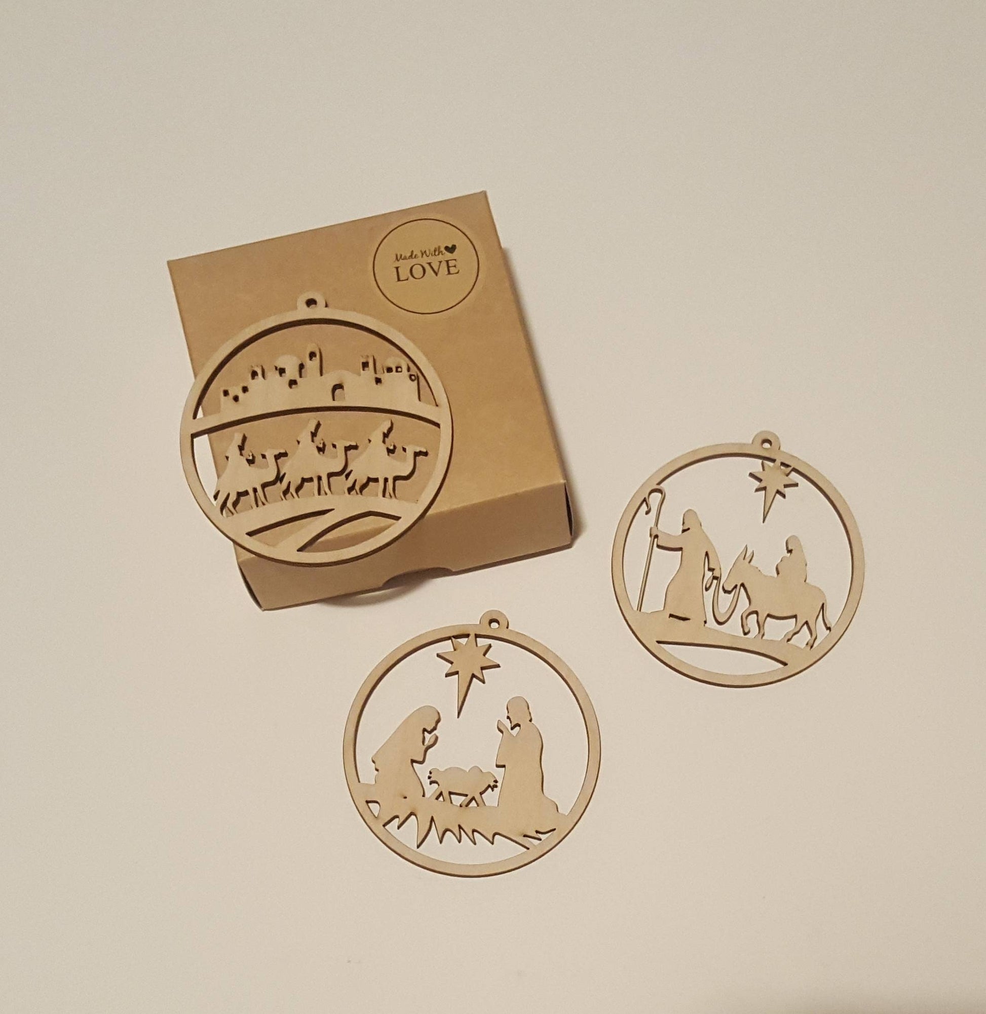 Wooden Nativity Scene Set, Laser Cut Christmas Ornaments, Hanging Balls Decorations, Natural Wood Home Decor 3.5" Set of 3, 5 or 9 ornaments