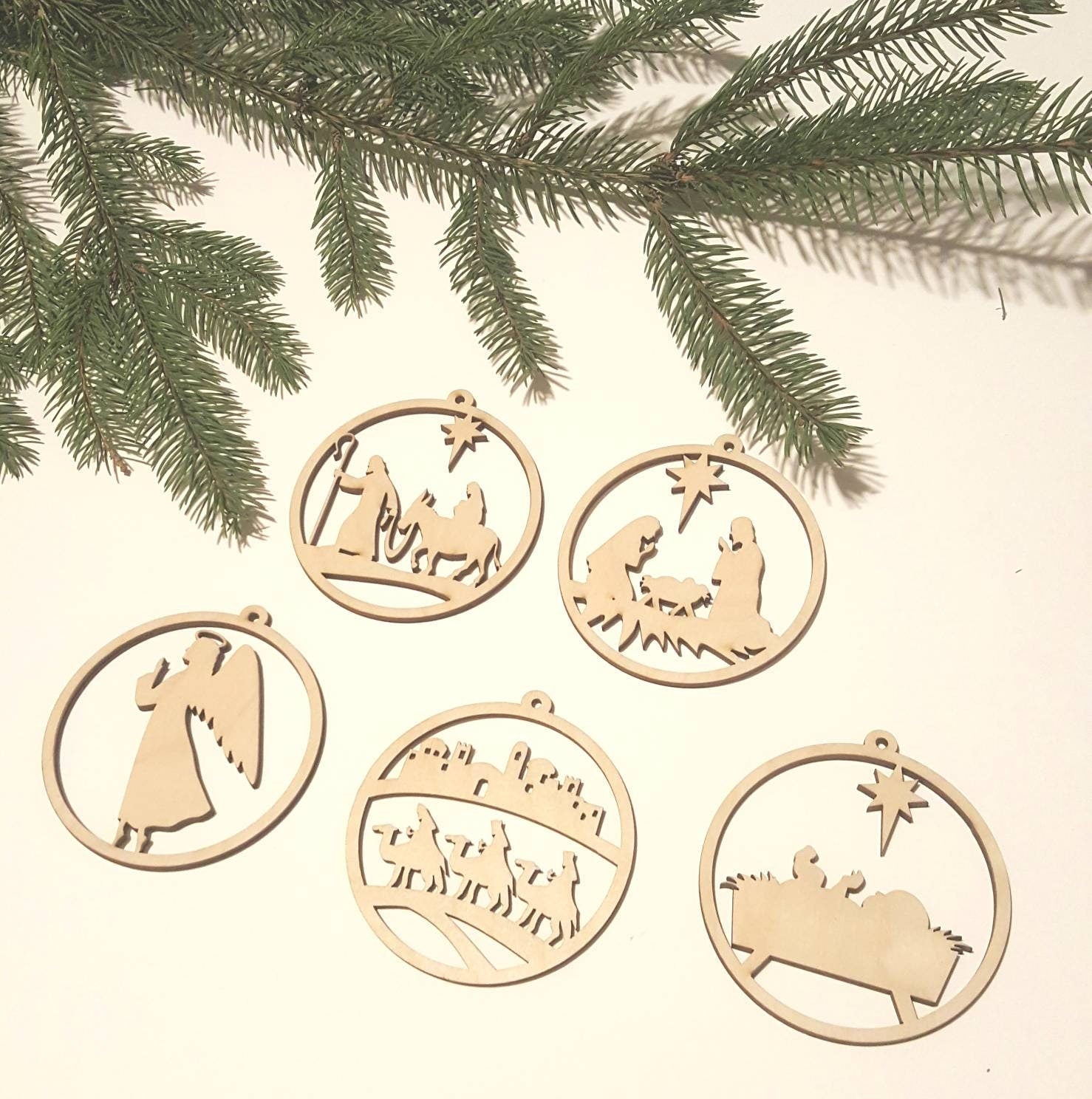 Laser Cut Wooden Nativity Scene Ornament Set: Natural Wood Christmas Decor