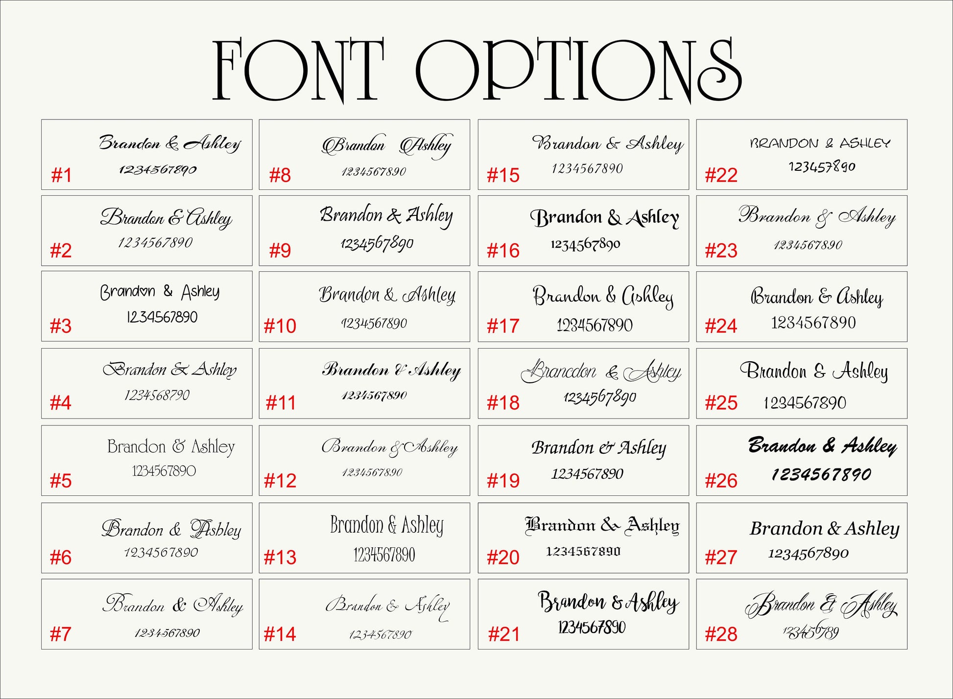 Find the "Font Option" TAB under the price, choose liked font and add to cart.